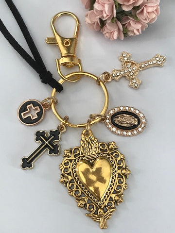 Porte-clés coeur sacré et croix, cadeau pour maman ex voto, breloque médaille miraculeuse, porte clé croix coeur sacré, porte clé violet