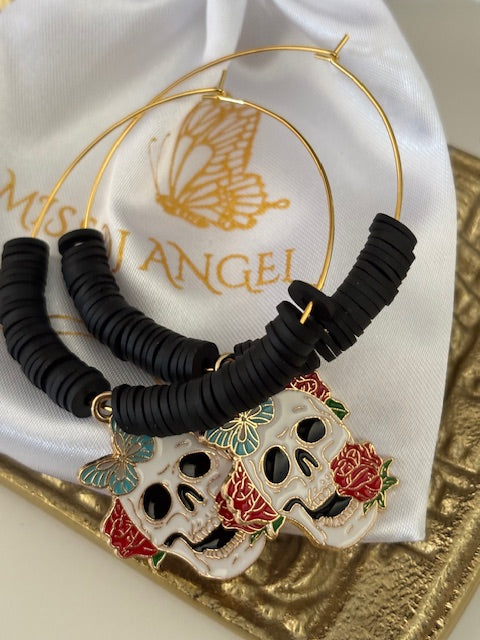 diamètre des créoles 4 cm, avec perles heishis noires de 8 mm et un pendentif représentant une tête de mort mexicaine en émail avec rose rouge et papillon bleu, longueur du pendentif 2,5 cm