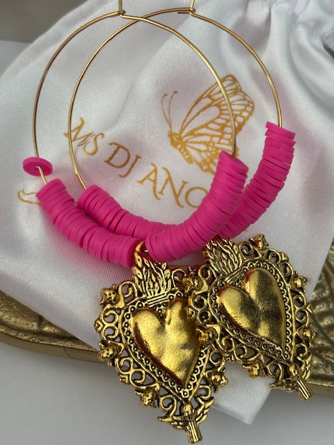 créoles dorées de 4 cm aves des perles heishis de couleur "fuchsia" de 5 mm et un pendentif coeur sacré ex voto doré de 3, 5 cm