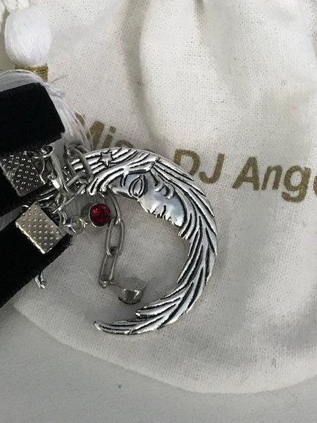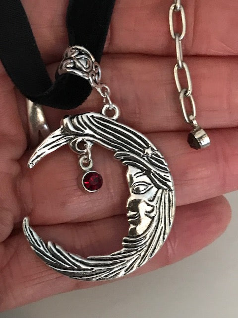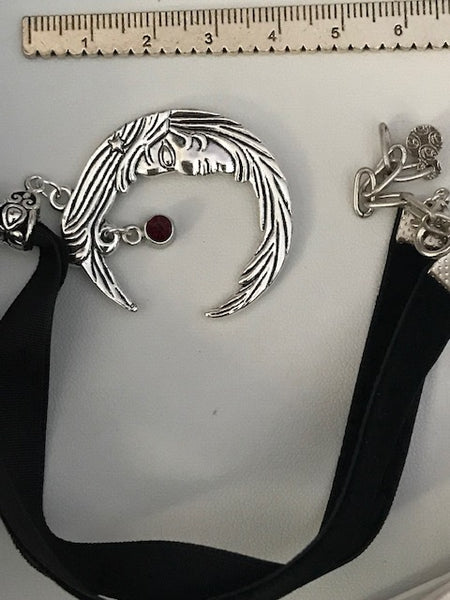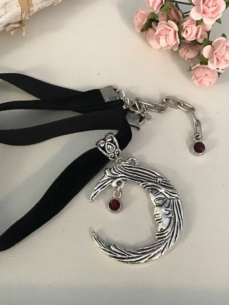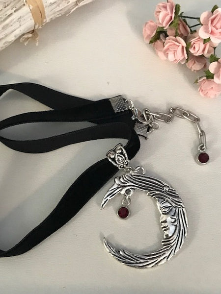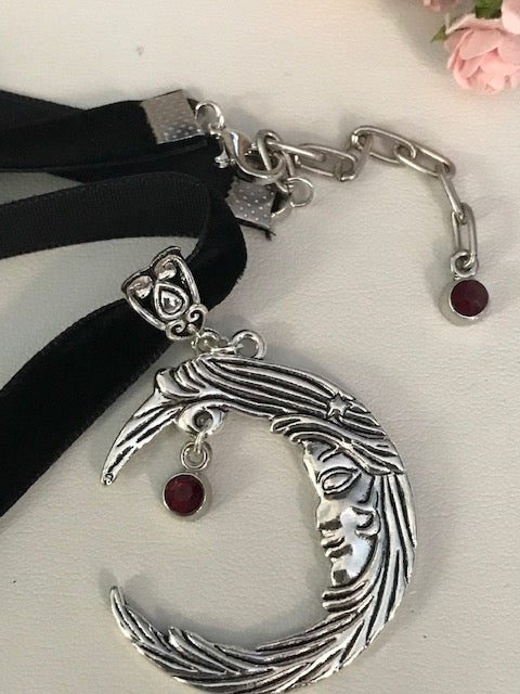 Ce ras de cou est réalisé en métal argenté et ruban, composé d'un ruban de velours noir de 1 cm et d'un pendentif lune avec strass grenat, chaîne d'extension également avec strass grenat