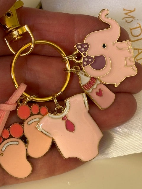 ce porte clés est réalisé en métal doré et émail rose, comprenant des breloques :